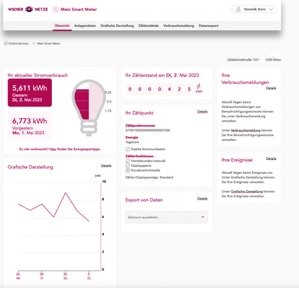 Sobald man einen Zugang zum Smart-Meter Portal der Wiener Netze hat, kann man seine Daten einsehen. Die Startseite sieht so aus: | |||